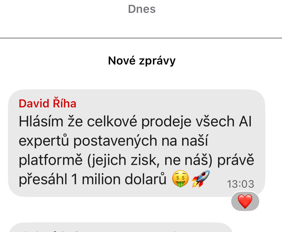Prodáváte pouze přístup k vašemu AI expertovi jako hlavní službu - jako mentora, kouče, průvodce ve vašem tématu, se kterým si může člověk povídat 24/7.