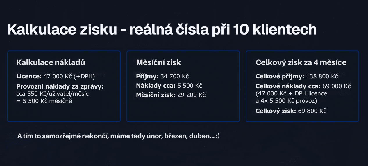 Prakticky to znamená, že když prodáte klientovi měsíční tarif za 3470 Kč, ve kterém má 1000 zpráv, tak teoreticky, kdyby je použil všechny, máte na tom náklad cca 1600 - 1800 Kč a zisk 1670 - 1870 Kč.